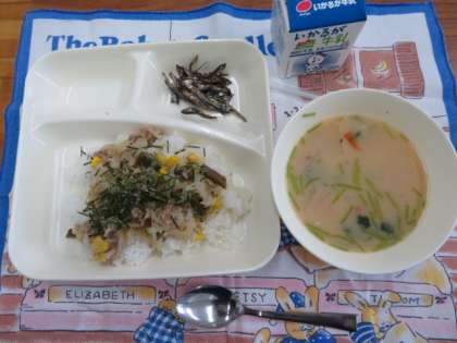 正月には新しい年の始まりを祝い「今年も健康に過ごせますように」と願って食べる料理がたくさんあります。今日の給食では「雑煮」と「ごまめ」です。
