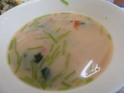 「雑煮」は、もちといろいろな具材を入れた汁物です。地方や家庭ごとに入れる具や味付けなどに特色があります。給食では、白みそで味をつけた関西風雑煮です。