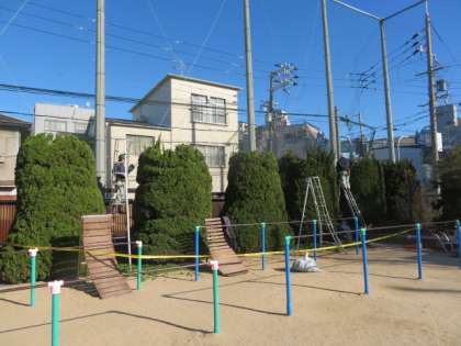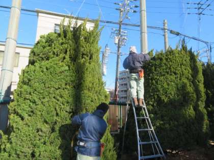 厳しい寒さの中でしたが、昨日に続いて運動場周りのカイズカイブキの剪定作業をしていただきました。