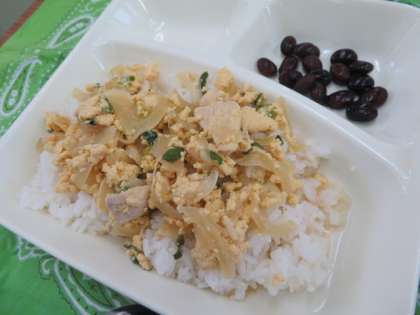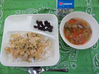 献立は、親子どんぶり、すまし汁、黒豆の煮物、牛乳でした。