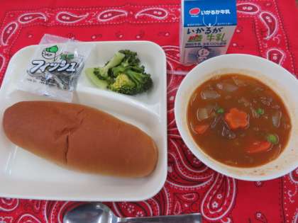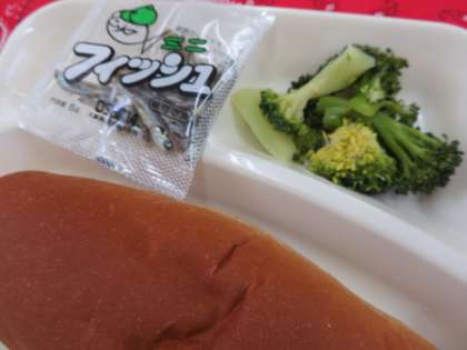 献立は、ビーフシチュー、ブロッコリーのサラダ、ミニフィッシュ、黒糖パン、牛乳でした。
