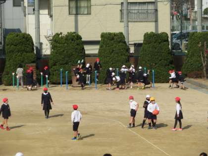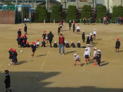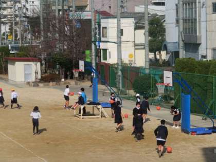 天気が良く気温も上昇したせいか、多くの子どもたちが運動場いっぱいに広がって、それぞれがお気に入りの遊びに夢中になっていました。