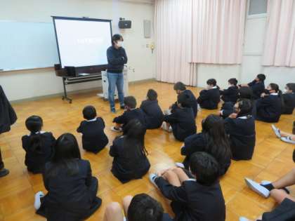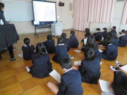 歌「しあわせ運べるように(神戸オリジナルバージョン)」を映像とともに、子どもたちはその歌詞の意味を受け止めながら聴いていました。