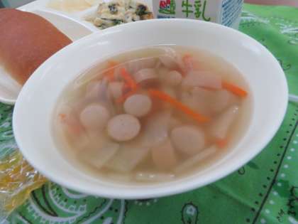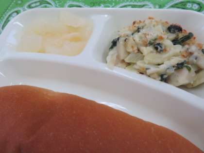 献立は、ホタテ貝のグラタン、スープ、和梨(カット缶)、マーマレード、コッペパン、牛乳でした。