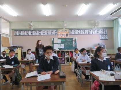 この時間は、5年1組で2組担任とC-NETの先生が英語の指導をしていました。