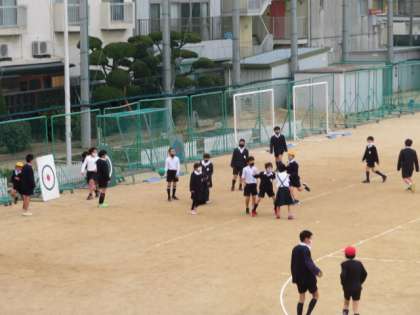 1/19 火 休み時間  雪がちらつく中で