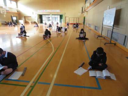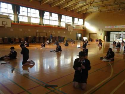 講堂で十分に距離間隔をとって、ピアノ伴奏に合わせてリコーダーの練習をしていました。