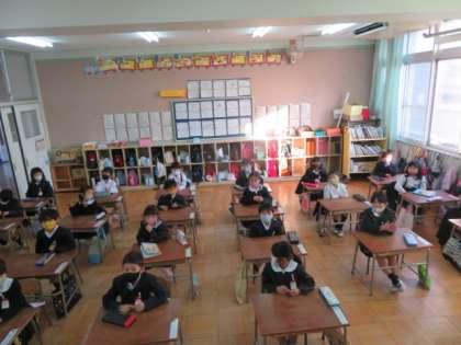 職員室からの放送で児童集会を行いました。