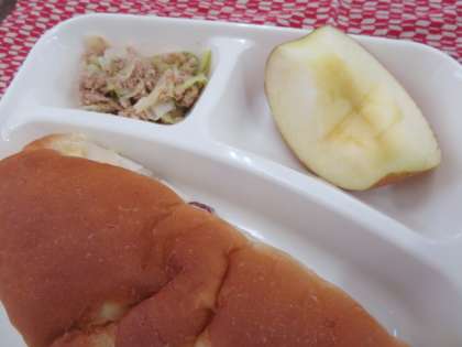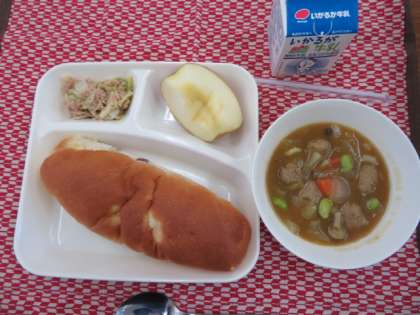 献立は、ミートボールと野菜のカレー煮、ツナとキャベツのソテー、りんご、おさつパン、牛乳でした。