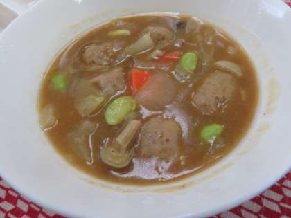 ミートボールと野菜のカレー煮は、ジューシィーなミートボールとニンジン、だいこん、たまねぎ、しめじ、えだまめなどの野菜がカレー風味のスープで煮込まれており、それぞれの具材の味を楽しみながらとてもおいしくいただきました。