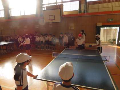 多目的室で活動する「室内遊びクラブ」、講堂で活動する「卓球クラブ」の見学をしています。