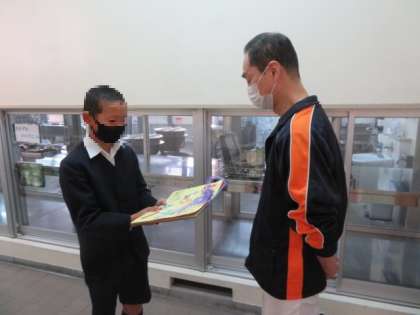 給食調理員一人ひとりに、子どもたちからのメッセージをまとめて綴ったものを給食委員会代表児童がプレゼントしました。