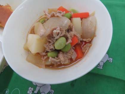 献立は、豚肉と野菜のケチャップ煮、カリフラワーのピクルス、もものクラフティ、黒糖パン、牛乳でした。