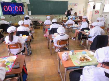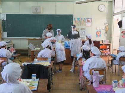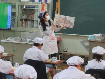 1組は、いつものように担任からの「本の読み聞かせ」を聴きながら静かに給食をいただいていました。
