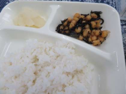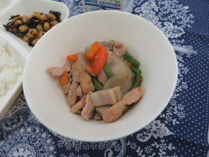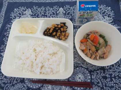 献立は、筑前煮、ひじき豆、大根のゆず風味、ごはん、牛乳でした。