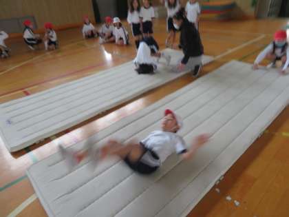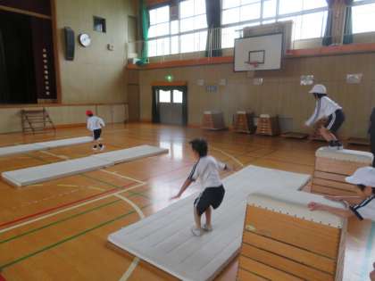 マットで前転がりなどをし、マットを川跳びで越えて、跳び箱で好きな形のジャンプから着地をしていました。