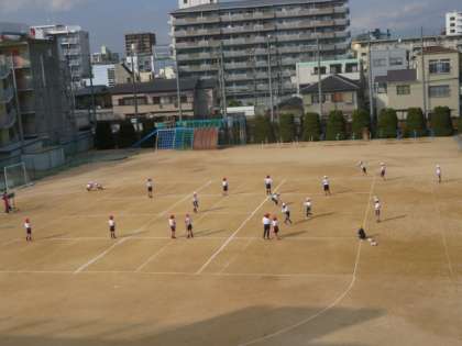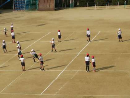 3年生は、このコロナ禍で非接触型のタグラグビーをしています。