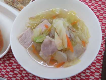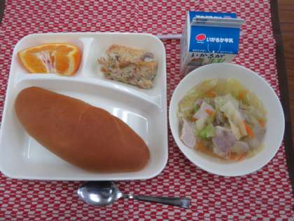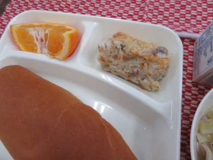 押麦のグラタン、スープ、伊予柑、黒糖パン、牛乳でした。