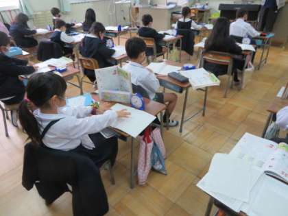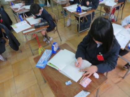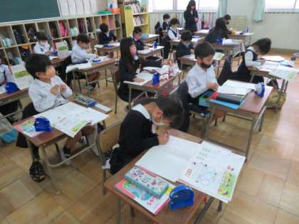 「とけいのはりを あわせましょう」ということで、何時何分かをプリントの時計の文字盤に書き込んでいました。
