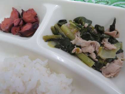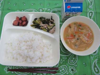 献立は、泉だこの柔らか煮、みそ汁、小松菜の煮びたし、ごはん、牛乳でした。
