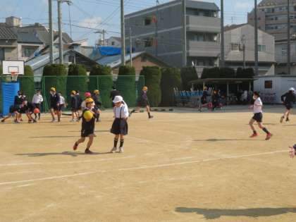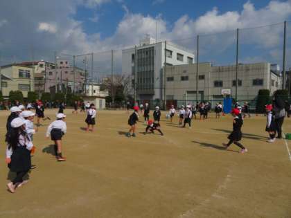 青空の下、上着を脱いで運動遊びに夢中になっている子どもも多いです。