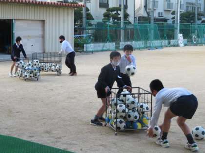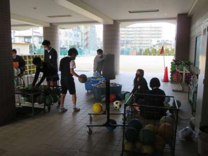 休み時間や体育の学習で使うバスケットボールやサッカーボールの空気入れを頑張っていました。