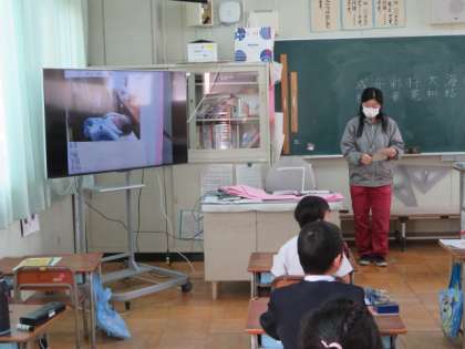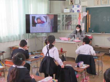 今日は、大型モニターに各自の小さかった頃の写真を映して、名前の由来などについてまとめる活動をしていました。
