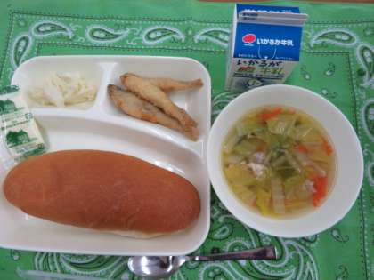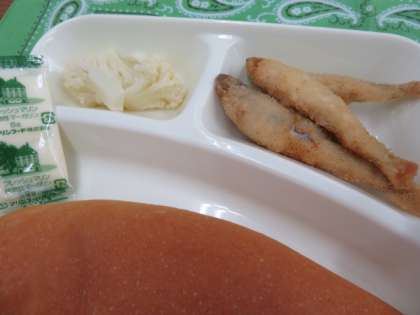 献立は、わかさぎフライ、白菜のスープ、カリフラワーのサラダ、ソフトマーガリン、コッペパン、牛乳でした。