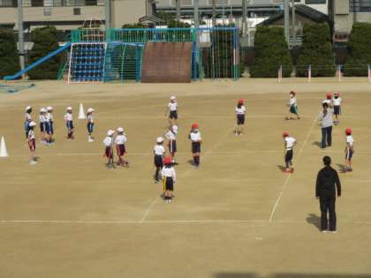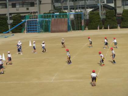 宝(ボール)を持った子どもが、オニにタグを取られないように通り抜けたら得点となるゲームをみんなで決めたルールを守って楽しんでいました。