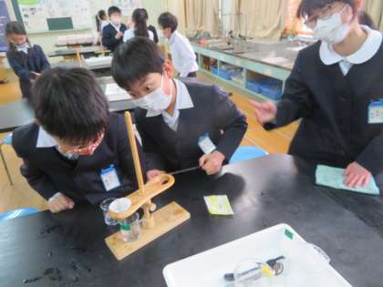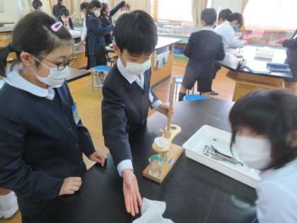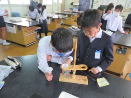 理科室で「水溶液を冷やすと溶けているものを取り出せるだろうか」という課題に対して予想を立てながら、実験をしていました。
