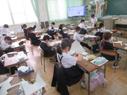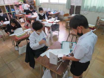 「はこの面に1まいずつ紙をはってきれいなはこを作りましょう」という課題で、各自が実際に紙を切って、立方体や直方体の面について学んでいました。