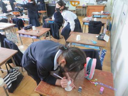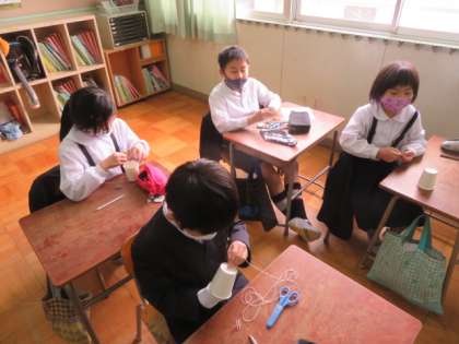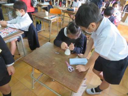 音のつたわりかたの学習で、今日は糸電話を紙コップとクリップとタコ糸を使って作っていました。
