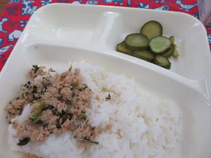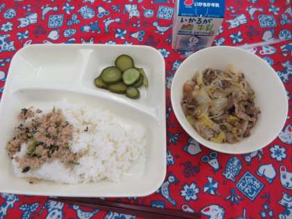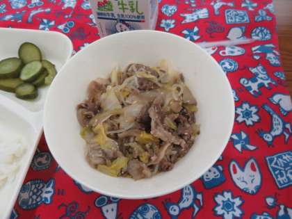 献立は、すき焼き煮(近江牛)、きゅうりのゆずの香あえ、ツナっ葉炒め、ごはん、牛乳でした。