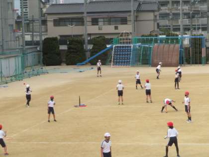 5年生の体育はこれからTボールをします。