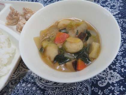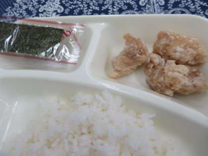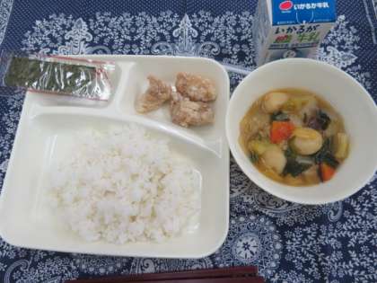 献立は、鶏肉のから揚げ、まるてんと野菜のうま煮、焼きのり、ごはん、牛乳でした。