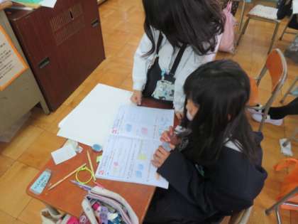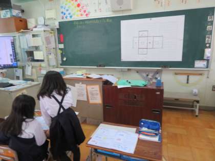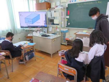 4年2組の教室では、「面と面のつながりを考えて、てんかい図をかこう」というめあてで、展開図をかいた後実際に紙を切って、直方体になるかどうか確かめていました。