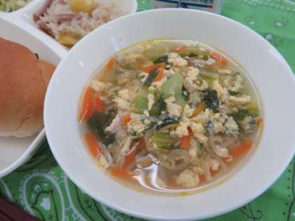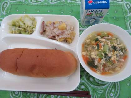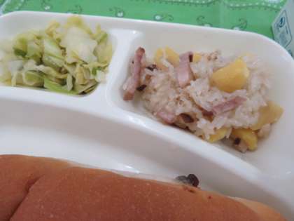 献立は、中華おこわ、たまごスープ、キャベツとピーマンの炒め物、レーズンパン、牛乳でした。