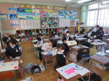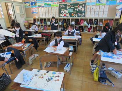 お話の絵で、パスで描いた後に背景などを水彩絵の具で塗っていました。