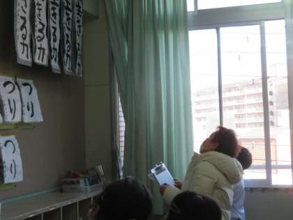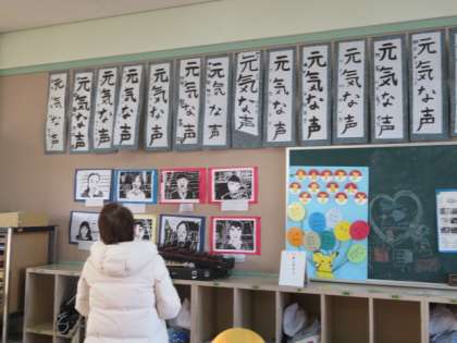 各学級ごとに行った席書会の作品をはぐくみネットの委員長様に観ていただき、表彰選考をしていただきました。