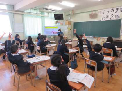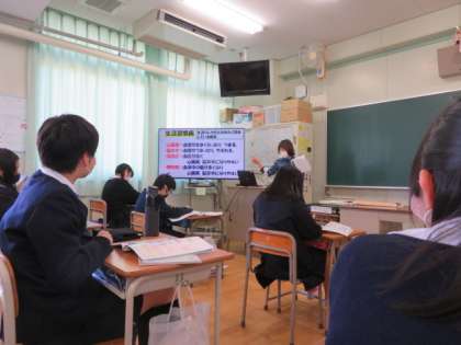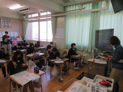 大型モニターに栄養教諭が編集した自作の資料を提示しながら、生活習慣病についてわかりやすく指導をしていました。
