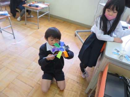 早く仕上げた子どもが「風ぐるま」を見せに来てくれました。