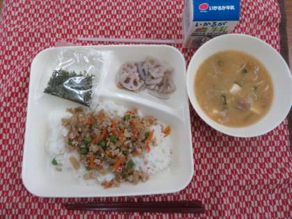 献立は、鶏ゴボウごはん、みそ汁、焼きレンコン、刻みのり、牛乳でした。