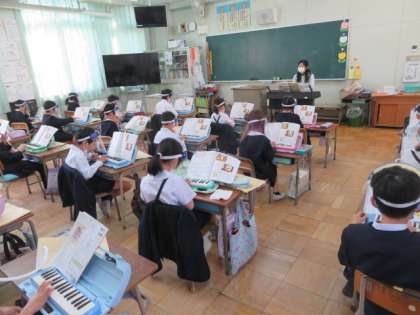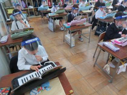 一人一台の鍵盤ハーモニカをディスタンスをとり、フェイスシールドを着けながら練習をしていました。