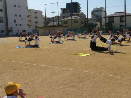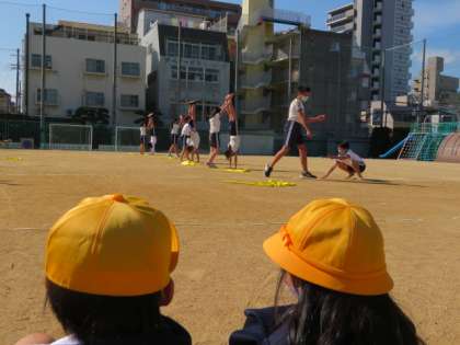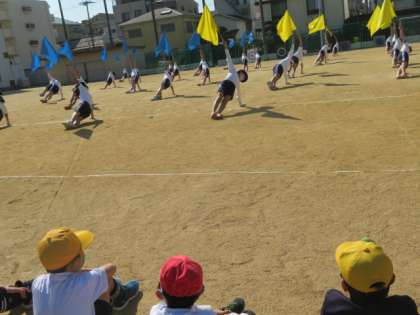1年生は、6年生の演技が決まるたびに大きな拍手で応援していました。