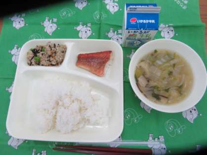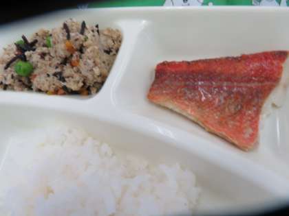 献立は、赤魚のレモンじょう油かけ、薄くず汁、高野豆腐の炒り煮、ごはん、牛乳でした。