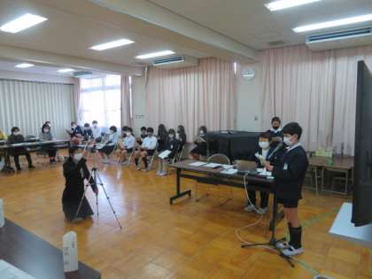 テーマは、「コロナ禍における生活習慣の変化について」ということで、健康委員会担当教諭、健康委員会児童で、アンケート調査をしたりまとめたりしたことをもとにして児童の生活の実態を発表しました。
