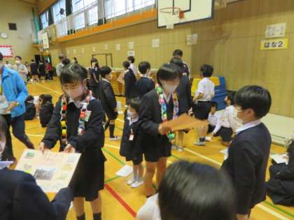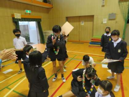 ゲームの後は、各縦割り班のメンバーから6年生に寄せ書きと首飾りのプレゼントがありました。