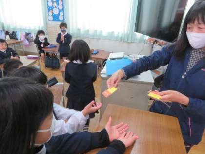 図書館ボランティア「本の森」様から、子どもたち一人ひとりに手作りの栞がプレゼントされました。