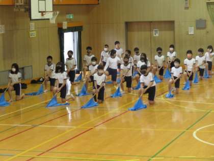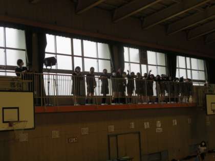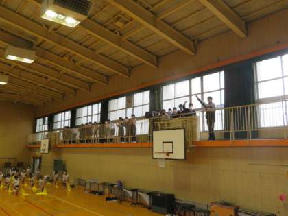 今日は雨模様の天気で運動場が使えないため、講堂で6年生のフラッグを使った集団演技を5年生が2階ギャラリーから観ました。