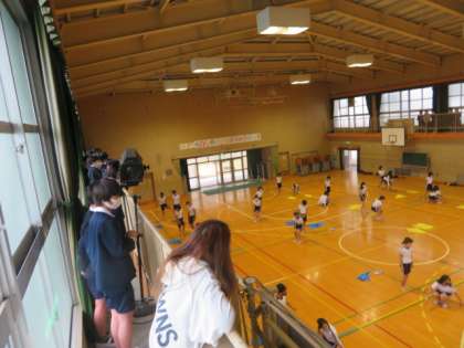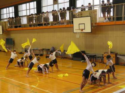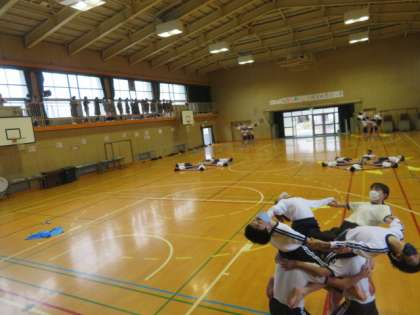 講堂でするので、6年生たちは運動場と違う間隔やポジションで演技をしていました。